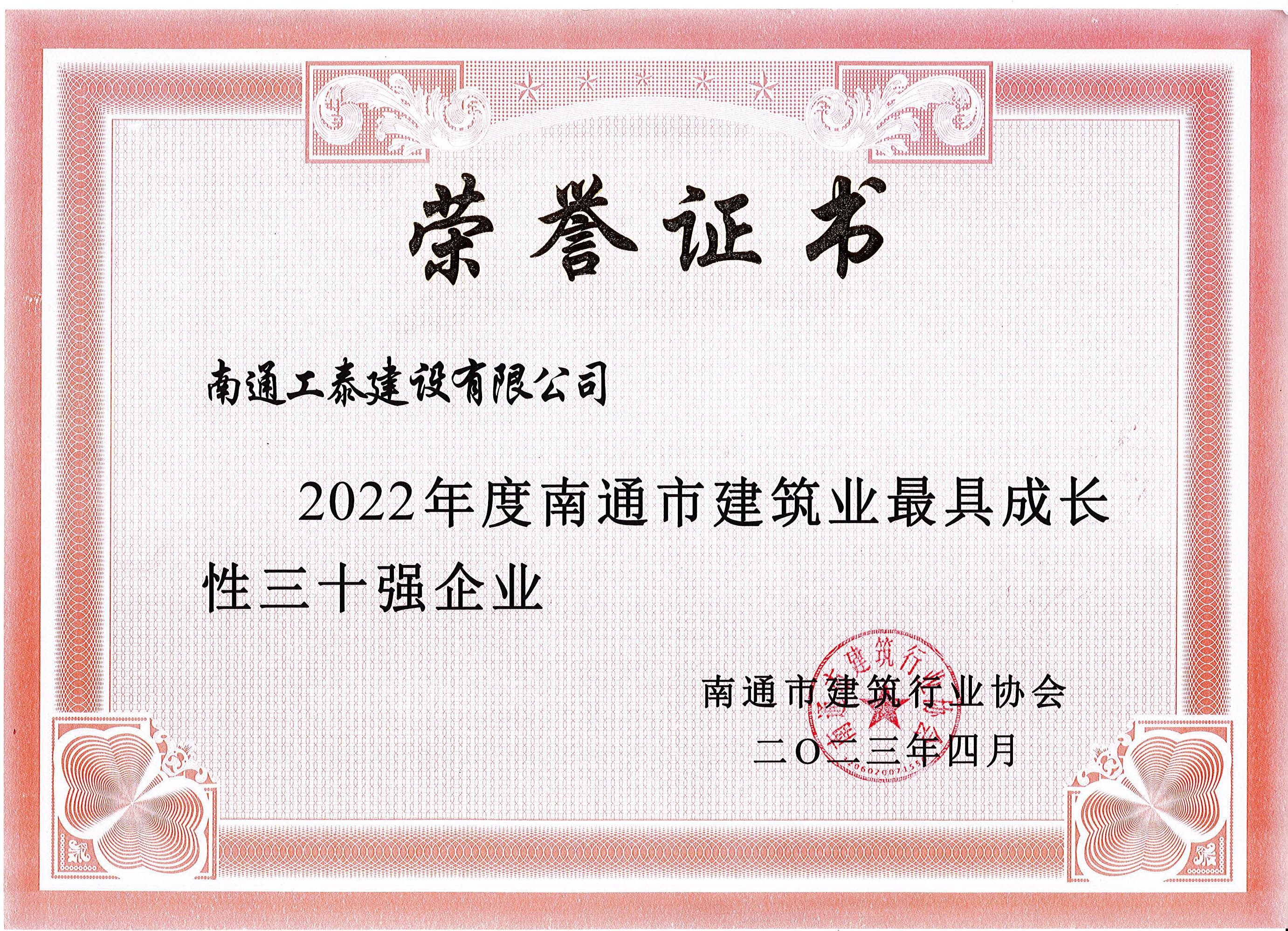 近日,從南通市建筑行業(yè)協(xié)會傳來喜訊:南通工泰建設(shè)有限公司獲評南通市“2022年度最具成長性三十強(qiáng)”建筑企業(yè)榮譽(yù)稱號;公司董事長、總經(jīng)理盧宏銀獲評“2022年度南通市建筑業(yè)優(yōu)秀企業(yè)家”榮譽(yù)稱號。